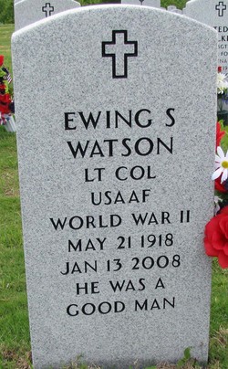 Lt. Col. Ewing Stuart Watson, the father of my aunt, Fran Davis (Watson), was born in Bowie, Texas, on 5/21/1918.  Stuart served during World War II as a B17 pilot in the 533rd Bombardment Squadron, 381st Bomb Group.  He flew 47 B17 missions over Europe and received the Distinguished Flying Cross, the Air Medal with 4 Oak Leaf Clusters, and the European-African-Middle Eastern (EAME) Campaign Medal with 6 Bronze Service Stars.  Stuart passed away 1/13/2008 and is buried in Dallas-Fort Worth National Cemetery.