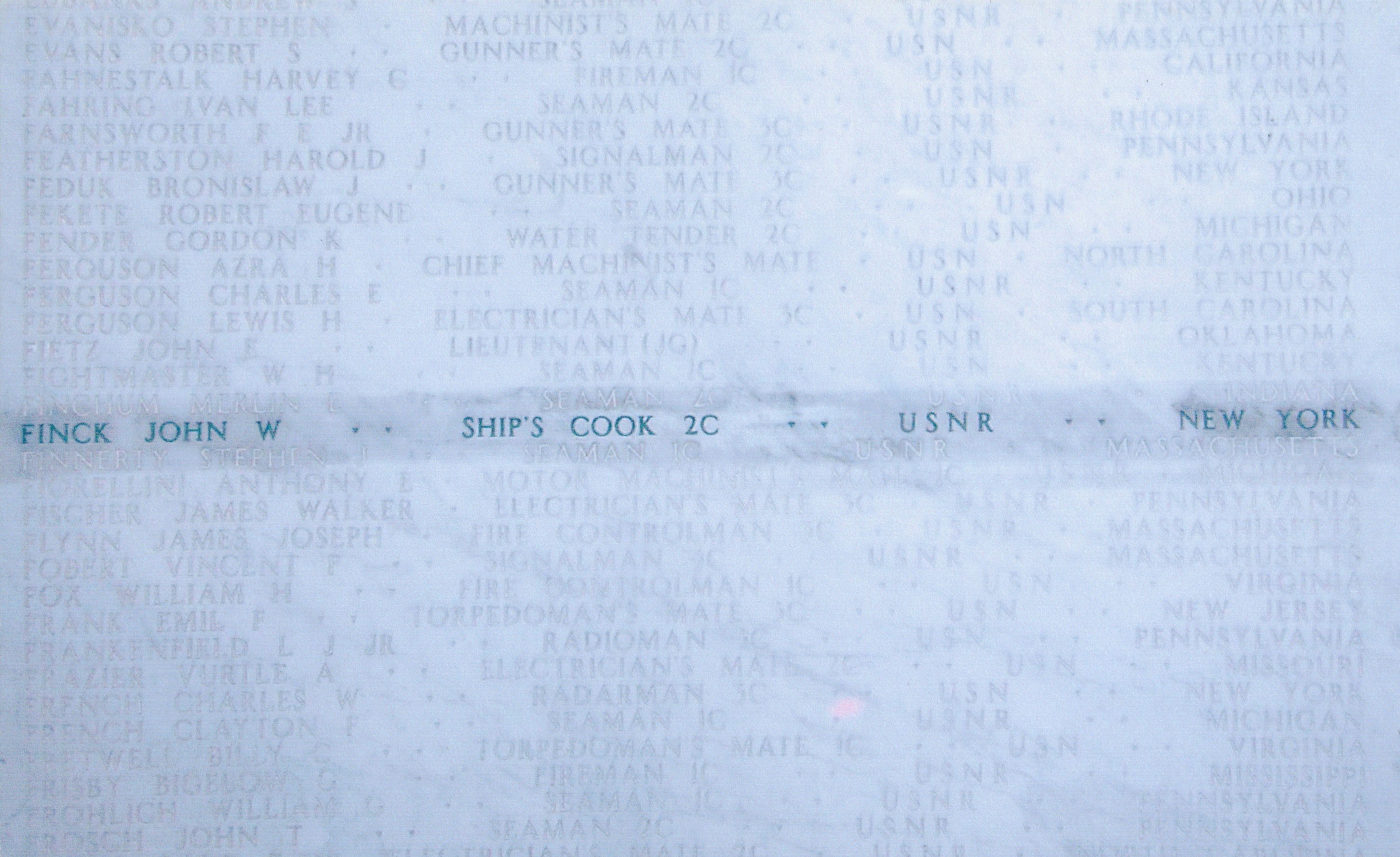John Finck was aboard LCI(L)-32 when it was sunk off the coast of Anzio, Italy. LCI(L)-32 was attempting to assist LST-422, when it hit a mine. Thirty of the crew were lost and 11 wounded. He was reported Missing in Action on January 26, 1944. His name appears on the Tablets of the Missing in Sicily-Rome American Cemetery and Memorial in Nettuno, Italy. His date of death is listed as January 27, 1945, one year and one day after he was reported missing.